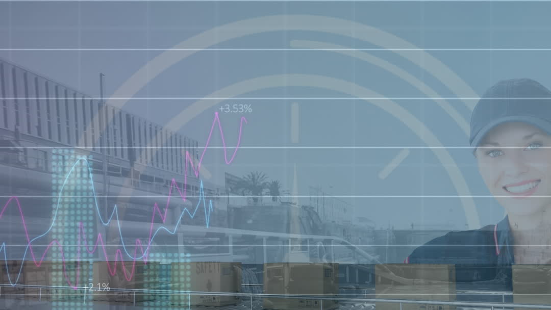 Smiling Female Worker with Finance Data Overlay in Manufacturing Station Video