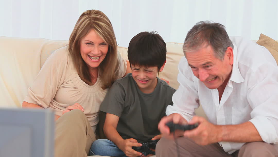 - Smiling Grandfather and Grandson Playing Video Games Together