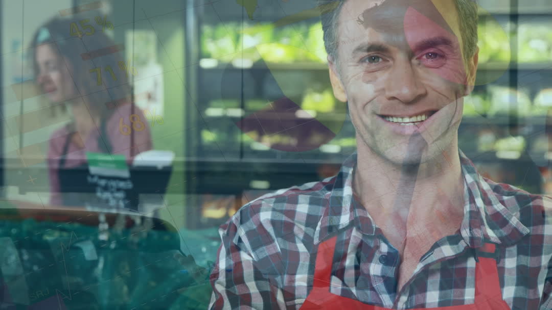 - Smiling Grocery Seller Overlaid with Financial Growth Charts