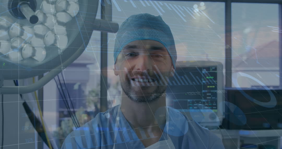 Caucasian male doctor smiling in hospital environment with overlay of digital data analytics, demonstrating integration of technology in healthcare. Ideal for healthcare innovation, medical tech articles, future of medicine themes, or hospital promotional use.