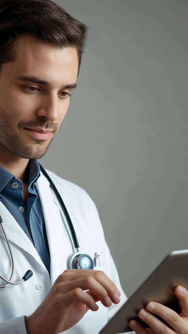 AI Generated Image. Video showing smiling male doctor wearing lab coat and stethoscope, tapping tablet and reading electronic notes against neutral gray background. Close-up vertical framing emphasizing professional expression and hands interacting with touchscreen. Useful for illustrating digital health, telemedicine, EMR workflows, modern healthcare technology. Perfect for hospital websites, clinic marketing, medical app demos, online training modules, social media ads, recruitment campaigns, presentation slides. Licensing suggestions: corporate use, editorial content, commercial promotions.