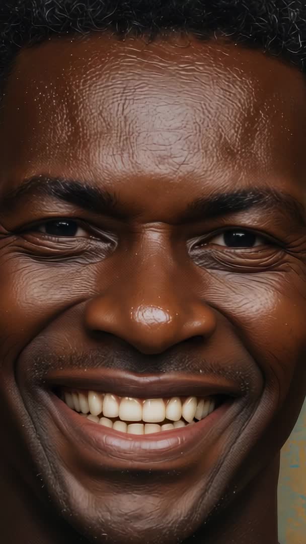 AI Generated Image. Closeup vertical headshot showing smiling man beaming directly into camera, teeth visible and eyes crinkling with genuine joy. High-contrast studio lighting highlighting skin texture and facial details for crisp, intimate feel. Suiting social media reels, profile videos, marketing campaigns, dental or oral care promotions, and customer service branding. Serving website hero clips, app onboarding sequences, influencer content, and corporate diversity storytelling. Suggesting trimming to 9:16 vertical crop, adding upbeat music and subtle color grade to enhance warmth, looping short segment for background or ad banners, and using closeup frame for thumbnail or profile preview.