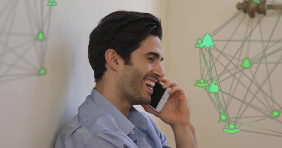 Smiling Man Communicatin with Smartphone and Digital Overlay Video
