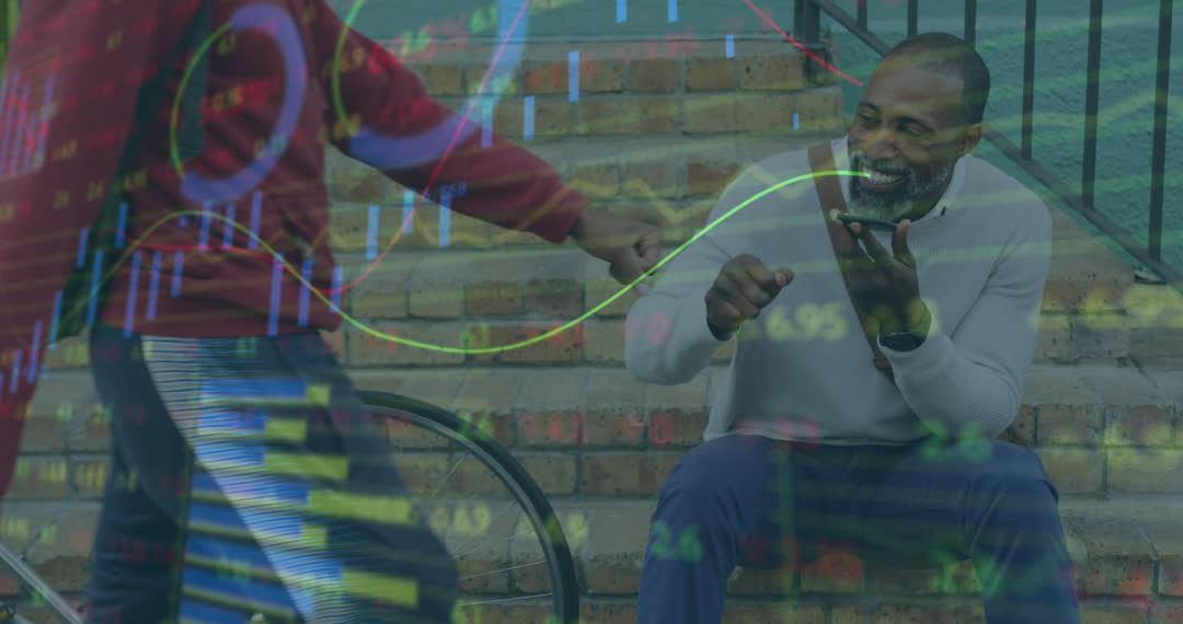 Smiling man interacting on mobile phone with a friend showcased against a digital overlay of financial data graphs, indicating technology amidst personal interaction. Ideal for illustrating modern communication and financial technology. Can be used in marketing, tech blog posts, or digital lifestyle concepts.