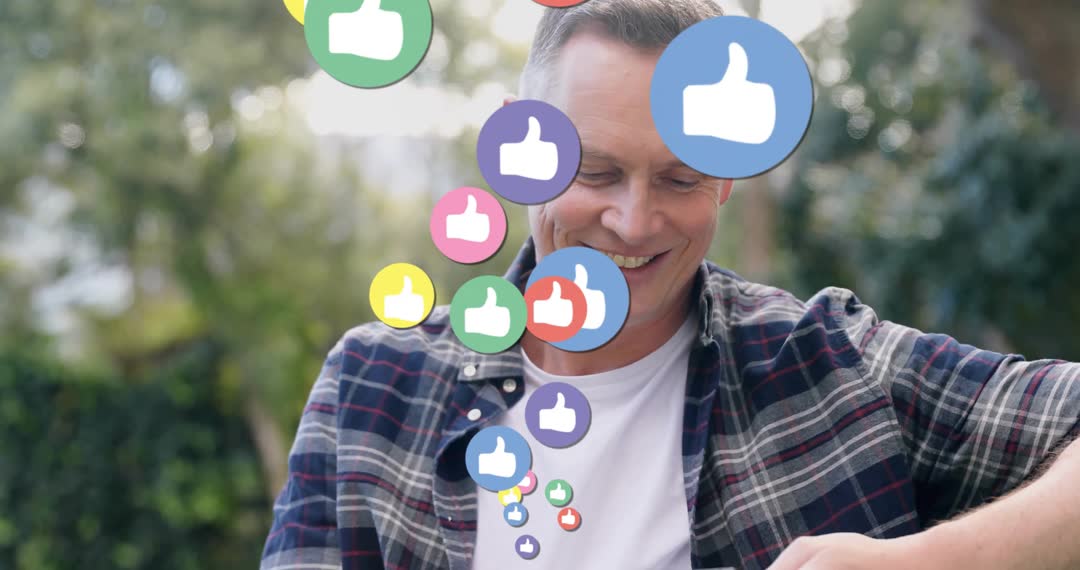 A man sits outdoors in a garden while engaging with social media on his smartphone, as illustrated by cheerful, floating thumbs-up icons surrounding him. Perfect for themes of connectivity, leisure, digital lifestyle, or promoting social media platforms and positive online interactions.