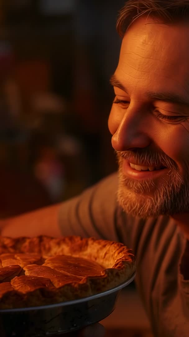 AI Generated Video. Vertical close-up video showing smiling man presenting freshly baked homemade pie in warm golden kitchen light. Camera slowly zooming in on pie pan and flaky crust while man smiling and leaning forward, creating intimate cozy mood. Warm color grading and soft bokeh background highlighting pastry texture and emotional connection. Use for cooking channel intros, recipe step transitions, holiday and Thanksgiving promotions, family lifestyle content, social media reels and vertical ads. Production tips: add subtle music and friendly voiceover, overlay recipe steps or ingredients, cut to close-up slices and pouring sauce for extended edit. Licensing ideas: using for restaurant promo, bakery social ads, seasonal marketing, cookbook videos, blog hero clips. Footage fitting brands emphasizing homemade comfort, family traditions, artisanal baking.