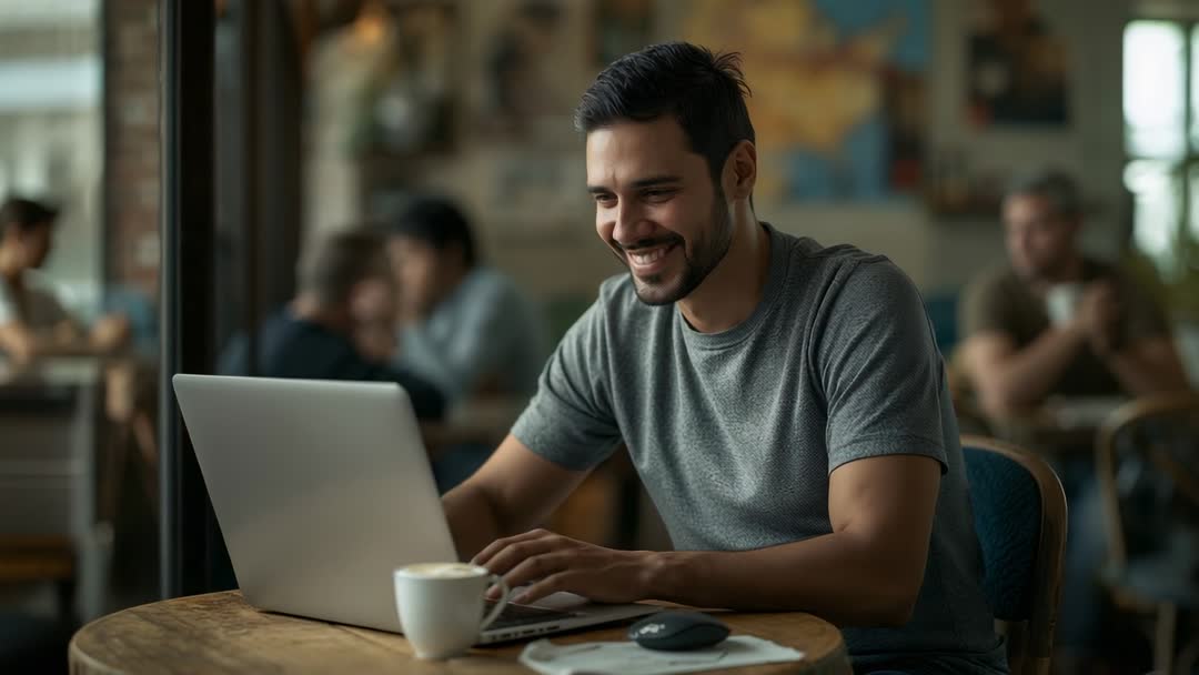 AI Generated Image. Video showing man in grey t-shirt sitting at cafe table, smiling while typing on laptop and reading humorous message. Coffee cup and wireless mouse resting on wooden table near laptop, earbuds visible on ear. Natural daylight entering through window, shallow depth of field keeping background patrons softly blurred. Framing emphasizing relaxed productivity, authentic remote work moment, casual social interaction and pleasant mood. Useful for remote work articles, freelance lifestyle features, social media content, coffee shop promotions, app marketing, online course thumbnails and corporate communications. Editing suggestions include cropping for widescreen hero banners, adding text overlay or lower-third captions, muting ambient audio, looping short clip for Instagram or TikTok, and color grading for warmer tones. Scene working well as header video for blogs, promotional ads, product demos, onboarding screens and presentation backgrounds.