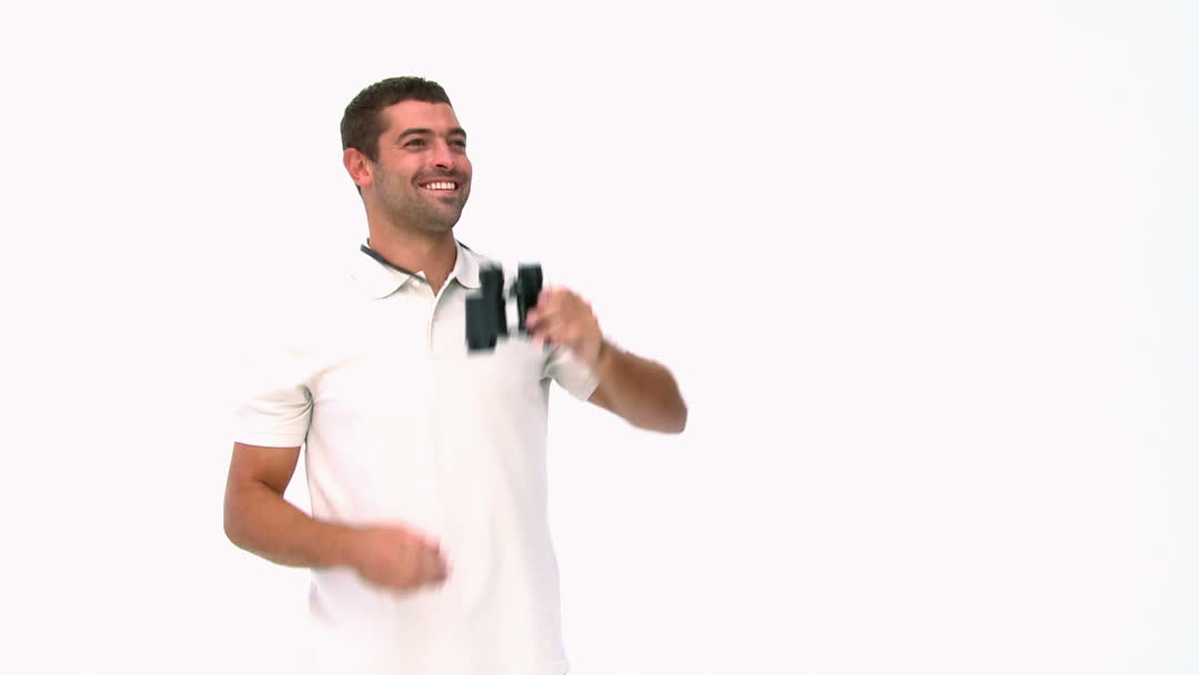 A joyful man is holding binoculars against a plain white backdrop, ideal for concepts of adventure, exploration, and curiosity. Perfect for advertisements related to hobbies or travel gear. This video may also suit educational and recreational publications focusing on outdoor activities.