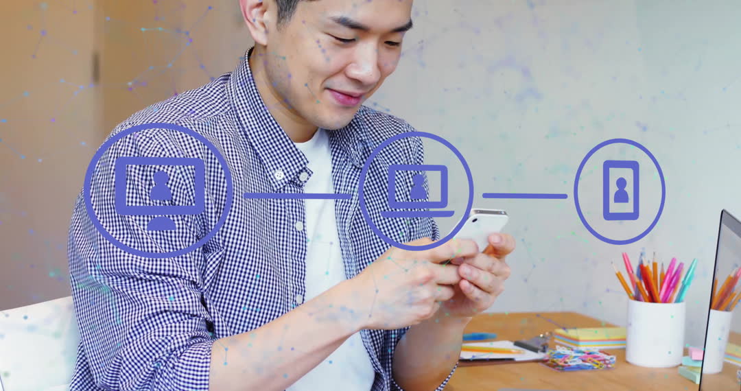 Asian man using smartphone with overlay of network icons depicts digital connectivity and communication. Ideal for illustrating themes of modern business technology, information flow, and mobile communication strategies. Could be used in blog posts about advancements in technology, mobile app promotion, or social networking content.