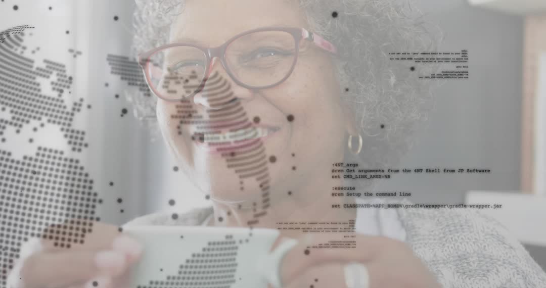 - Smiling Person Holding Cup with Digital Code and World Map Overlay
