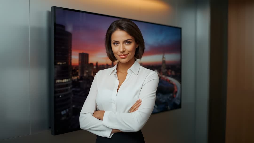 AI Generated Image. A professional presenter shifts from a casual smile to a confident demeanor in a sleek modern studio with a city skyline on the screen. Ideal for showcasing corporate presentations, business solutions, or TV broadcast elements. The image reflects professionalism and elegance, making it useful for business commercials, executive conferences, and formal communication videos.