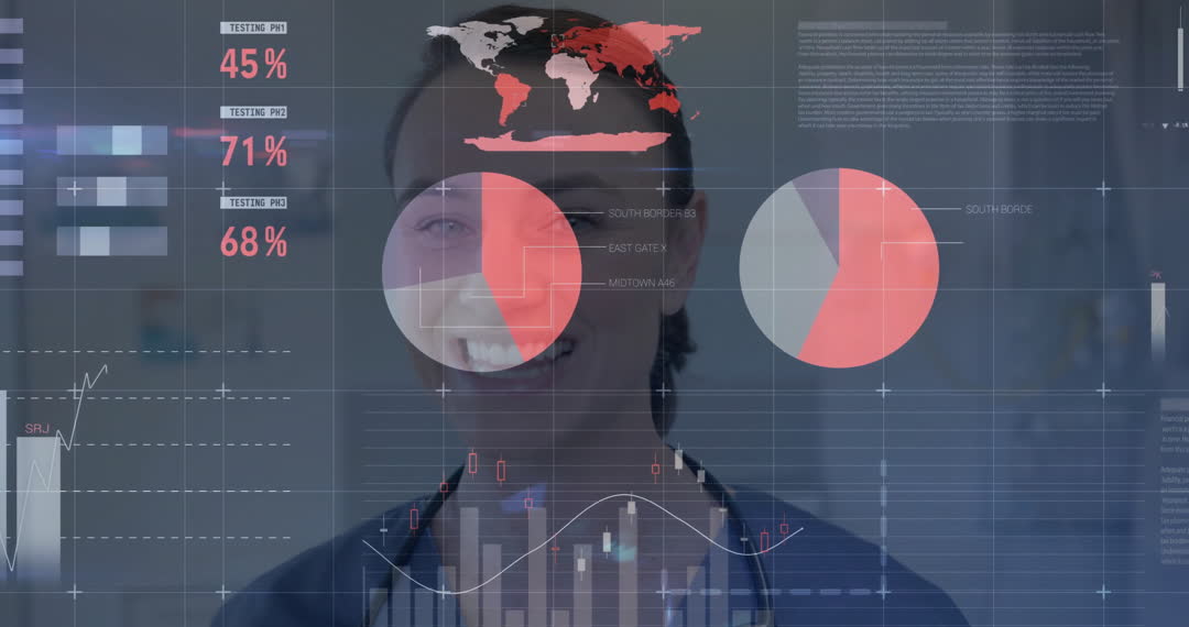 Smiling woman engaging with digital interface showcasing global testing statistics through animated infographics and analytics. Useful for illustrating concepts of modern technology, big data analysis, professional environments, and global business.