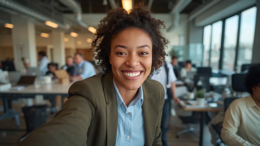 - Smiling professional woman reaching for camera while walking through modern open-plan office