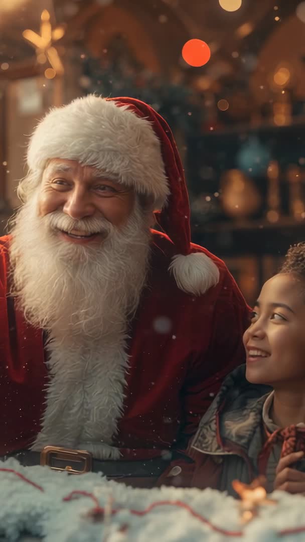 AI Generated Image. Vertical video showing smiling Santa leaning and reassuring child while child holds treat at market stall with warm lights, ornaments, and gentle snowfall. Scene conveying trust, wonder, and intergenerational connection, ideal for holiday storytelling and seasonal branding. Use for social media reels, Instagram and TikTok ads, festive commercial spots, holiday campaign banners, store window displays, greeting card animations, charity appeals, family blog headers, and event invitations. Production tips: apply warm color grade, add soft bokeh and slow-motion close-ups, insert gentle instrumental or sleigh bell soundtrack, include overlay headline like 'Believe in Magic' or 'Holiday Moments' and leave safe space for logo and CTA. Deliverables: vertical aspect ratio optimised for mobile viewing and short-form platforms.