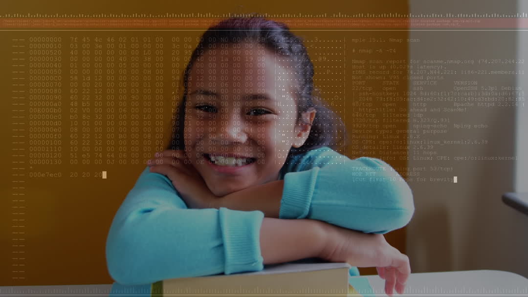 Young schoolgirl smiling and resting arms on stacked books. Ideal for educational materials, promoting literacy programs, or representing joyful learning environments in schools.
