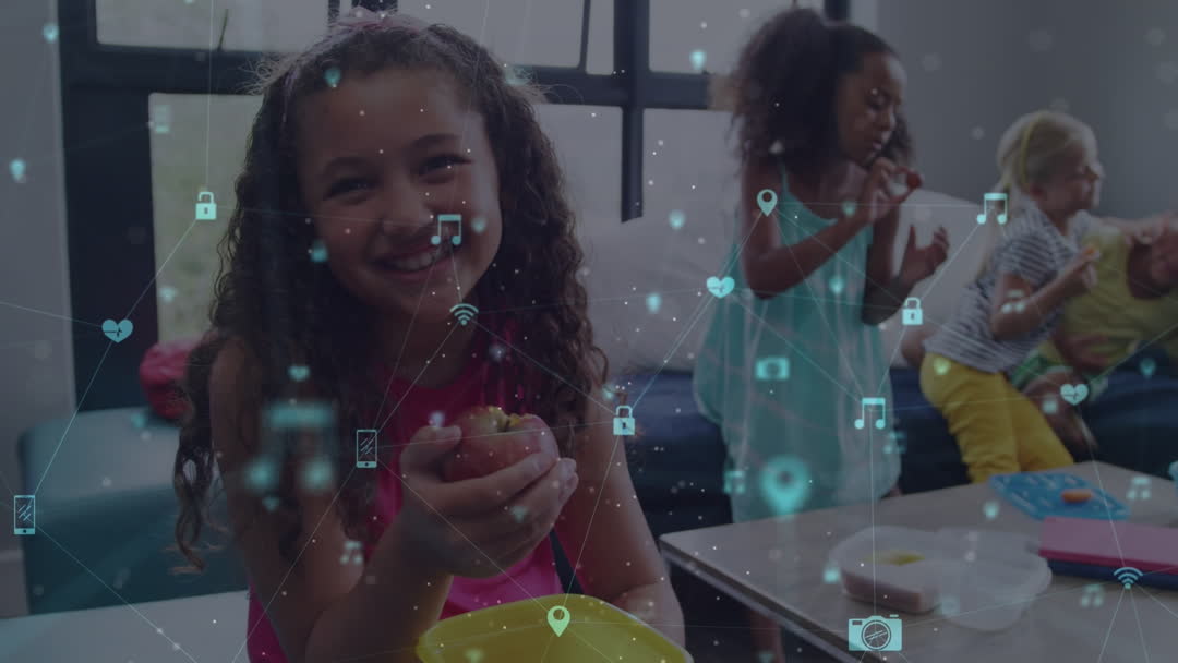 Smiling Schoolgirl in Classroom with Technology Overlay Video