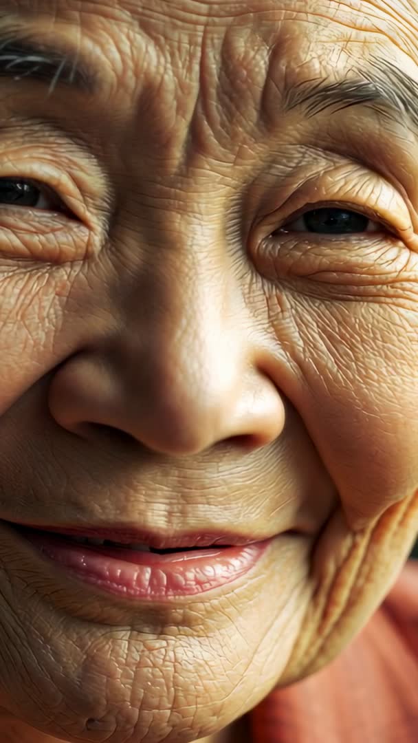 AI Generated Image. Video showing close-up portrait of smiling senior Asian woman leaning forward in rust top, highlighting facial wrinkles, skin texture, gentle smile and expressive eyes. Shot capturing intimate moment for use in healthcare, senior care, aging gracefully, family memory, personal storytelling and cultural projects. Footage suiting website banners, social media reels, documentary sequences and advertising campaigns about elder wellbeing, skincare for mature skin and intergenerational connection. Cropping and vertical orientation fitting mobile-first platforms and short-form video. Color palette offering warm tones and natural light for compassionate, authentic storytelling.