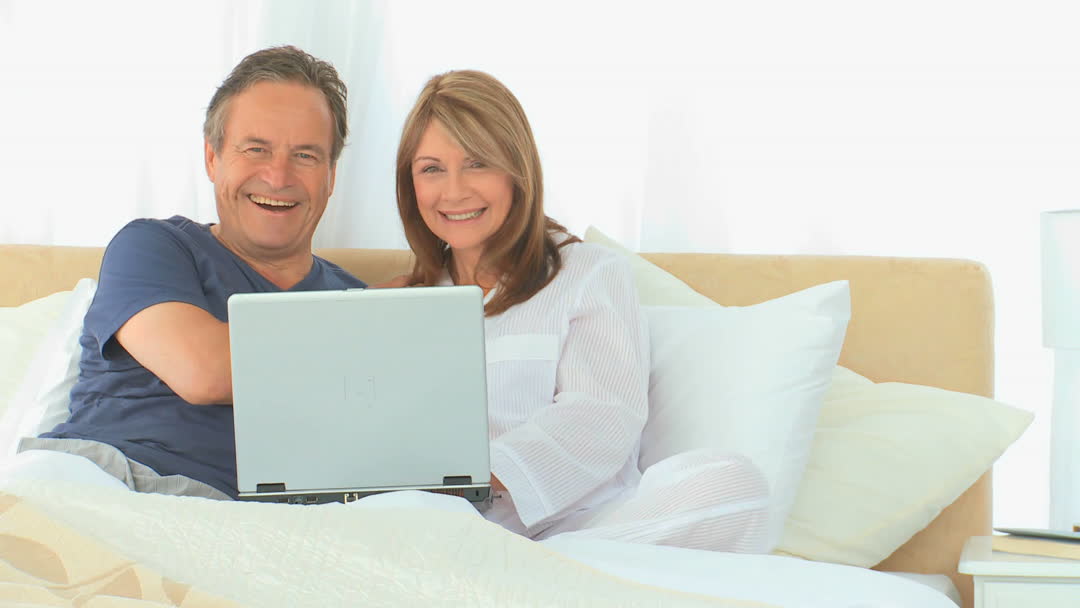 - Smiling Senior Couple Relaxing in Bed with Laptop