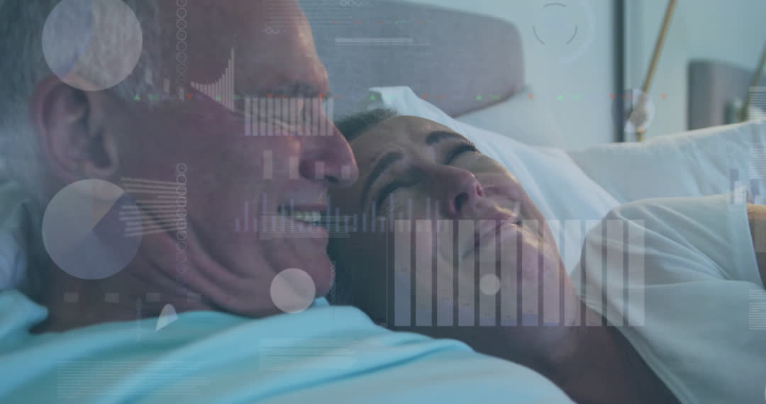 Calm scene featuring smiling senior couple lying in bed, overlaid with futuristic data graphics conveying advancing technology and analysis in daily life. Ideal for use in marketing campaigns about senior lifestyle, promoting modern technology for retirees, or topics on happiness and wellness.