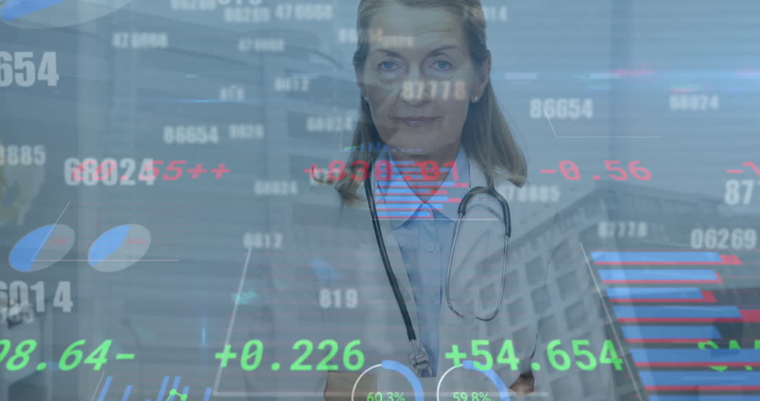 A senior female doctor is smiling confidently with a backdrop of statistical data and graphics suggesting technology in healthcare. This could be used for topics on the integration of medical practice with technology, future of healthcare industries, or an article helping to educate about ongoing modernization efforts within medical fields.