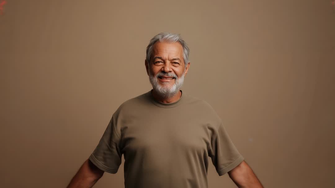 AI Generated Image. Video showing smiling senior man posing with arms extended, lowering arms to sides against beige backdrop, wearing olive t-shirt and soft warm lighting. Mood conveying warmth, approachability, confidence, and healthy aging. Working well for website banners, social media ads, brochure spreads, editorial features on aging and lifestyle, healthcare and wellness campaigns, retirement planning materials, caregiver training resources, corporate profiles, and personal branding. Frame allowing text overlay on both sides for headline and call-to-action. Showing midshot head-and-torso composition, natural facial expression, studio lighting, shallow depth-of-field and neutral color palette matching modern lifestyle and wellness aesthetics.