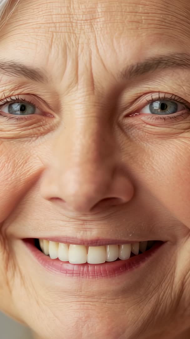 AI Generated Video. Vertical closeup headshot video showing smiling senior woman gazing directly into camera. Framing including eyes, nose, mouth and upper cheeks with visible wrinkles and natural skin texture. Studio lighting delivering soft even illumination and warm skin tones. Conveying warmth, confidence and authentic aging beauty. Suggested uses: featuring in skincare and anti-aging advertising, dental and cosmetic dentistry campaigns, senior lifestyle and healthcare promotions, patient testimonials, social media reels and short-form vertical ads. Production notes: capturing 9:16 aspect ratio, shooting duration 10-30 seconds, supplying loopable smile sequences, recommending gentle background music and optional subtitles for accessibility.
