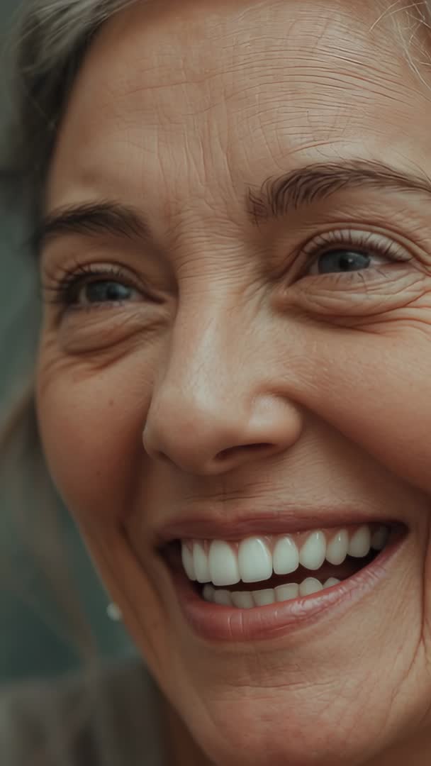 AI Generated Video. Vertical video showing smiling senior woman in close-up, laughing and revealing bright teeth while wearing pearl earring, showcasing natural wrinkles and gray hair. Footage conveying warmth, authenticity, and positive aging, capturing candid expression and close facial detail. Ideal for dental care promotions, anti-aging skincare campaigns, senior lifestyle and wellness content, testimonial reels, and social media vertical ads. Vertical format optimizing mobile playback and story reels, suitable for website hero sequences, magazine features, healthcare brochures, and stock video libraries.