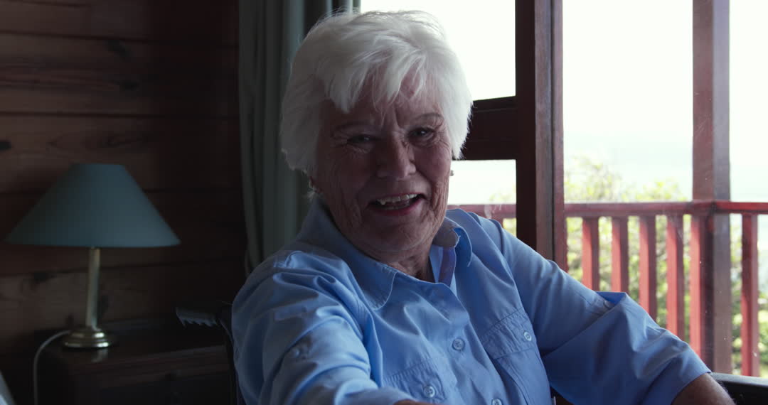 Senior woman with white hair is sitting comfortably in a wheelchair in her home. She smiles as natural light illuminates her face, symbolizing strength and independence. Perfect for use in articles or content about aging with grace, accessible living, or promoting positive lifestyles for seniors.