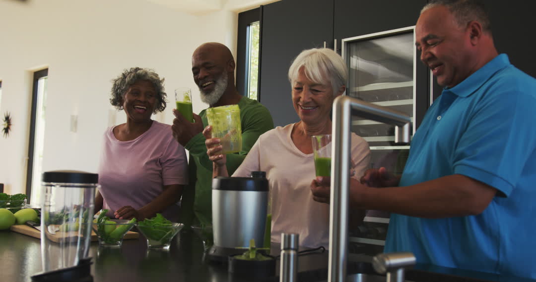Senior adults of diverse backgrounds are enjoying creating green smoothies in a bright, modern kitchen. This video demonstrates the joys of shared experiences and a commitment to a health-conscious, active retirement. Perfect for promoting content related to healthy living, social group activities, senior lifestyle, and diversity.
