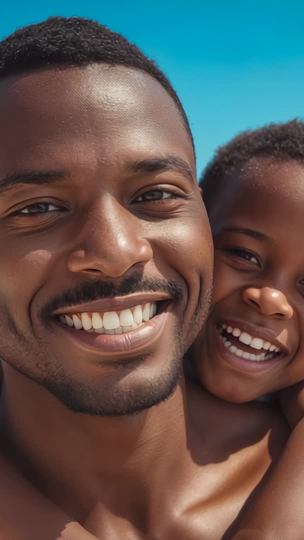 AI Generated Video. Video showing smiling shirtless father carrying child piggyback against clear blue sky, closeup on faces, natural sunlight highlighting skin tones and genuine emotion. Clip capturing playful bonding moment, bright colors, warm mood, and tight framing that emphasizes smiles and eye contact. Use for Fatherhood campaigns, parenting blogs, family lifestyle ads, mobile-first social content, travel and leisure promotion, dental or healthcare marketing, sunscreen and summer product advertising, seasonal greeting campaigns, and Father's Day promotions. Creative tips: Place text overlay or logo in upper third where sky provides negative space, use slow push-in or gentle stabilization for intimate feel, apply warm color grade and upbeat acoustic music to enhance joyful tone. Format suited for vertical 9:16 delivery, short-form clips, Instagram Reels, TikTok ads, and hero mobile banners.