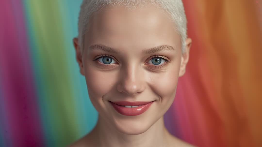 AI Generated Image. Recording close-up headshot of young short-haired woman holding steady gaze and smiling slowly against vibrant rainbow gradient backdrop. Framing centered on face with soft studio lighting and shallow depth of field creating smooth bokeh across striped backdrop. Camera movement remaining minimal with optional gentle push-in, suitable for 4K editing and cropping to square or vertical formats. Use for beauty and skincare advertising, social media profile intros, influencer content, lifestyle promos, casting reels, tutorial intros, brand hero banners, and onboarding videos. Editing suggestions: enhance rainbow tones with subtle color grading, add lower third for name or call-to-action, loop 3-6 second segment for background motion, apply light sharpening to eyes for emphasis. Model release recommended for commercial use.