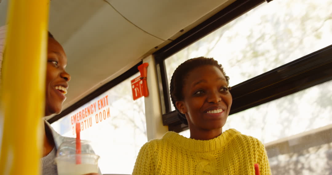 Two African American sisters enjoying a relaxed moment on a bus ride, engaging in friendly conversation and focusing on togetherness. Use this to illustrate themes of sibling relationships, everyday joy, and commuting experiences.