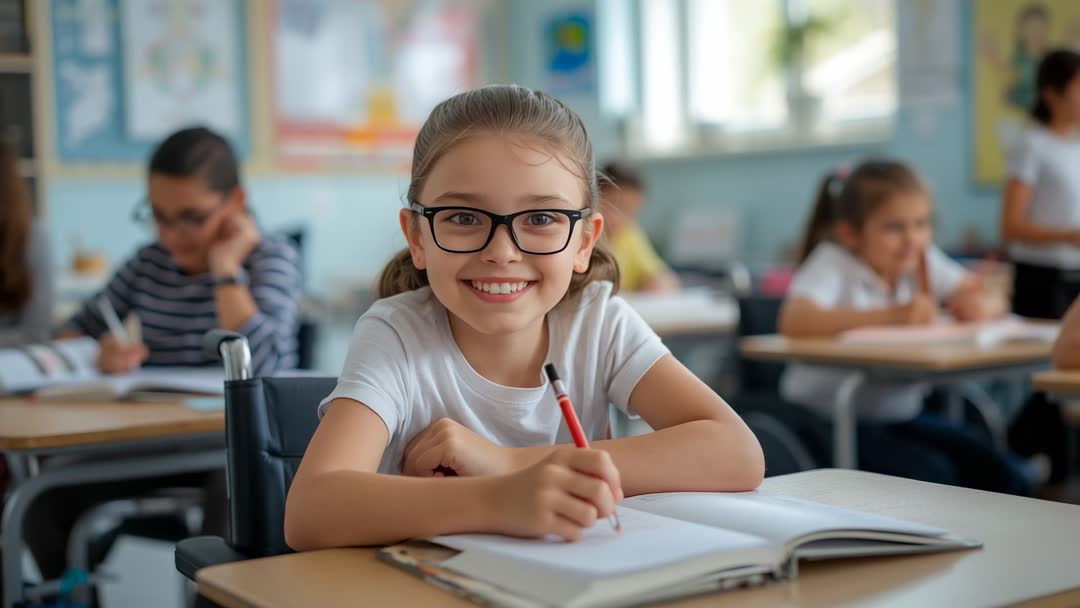 AI Generated Image. Young girl with glasses writing assignment at school desk while smiling. Ideal for topics on elementary education, student engagement, classroom activities, enhancing learning experiences, childhood development, or educational resources. Useful for illustrating browser learning environments, motivational articles, or promotional materials focusing on education.