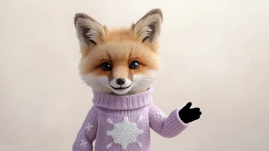 AI Generated Video. Smiling stylized fox puppet waving right paw while wearing lavender knitted sweater with snowflake detail. Close-up studio clip focusing on expressive eyes and soft fur, delivering warm friendly greeting for audience. Ideal for children's content, holiday greeting videos, mascot intros, social media loops, animated app mascots, or promotional spots for winter apparel and family brands. Using loopable action and clear face presentation for easy editing into longer sequences or overlays. Color palette and cozy knit styling supporting seasonal, family, playful, and educational themes.