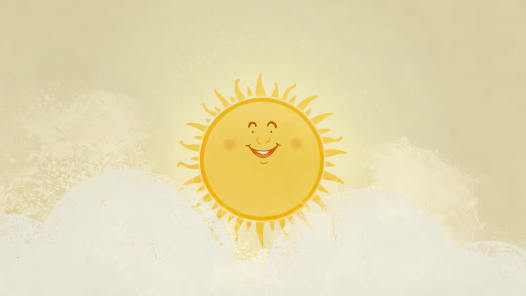 - Smiling sun character peeking above soft clouds at dawn, whimsical animated sunrise scene