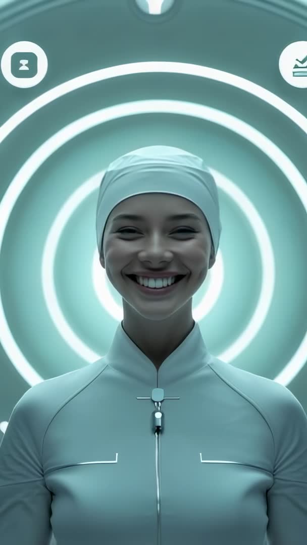 AI Generated Video. Vertical video showing smiling medical technician undergoing diagnostic scan inside futuristic scanning pod, surrounded by concentric ring lights. Cool teal lighting and symmetrical composition creating sense of precision, progress, clinical innovation. Featuring sterile zip-front uniform and head cap, warm smile conveying trust and approachability while scan sequence is starting. Use for technology marketing, medical device launch, digital health campaign, telemedicine app intro, hospital branding, training videos, social media reels, mobile ad creatives. Editing suggestions: add subtle camera dolly, ambient synth soundbed, UI overlay icons for data readouts, loopable clip for background hero or vertical short-form content.