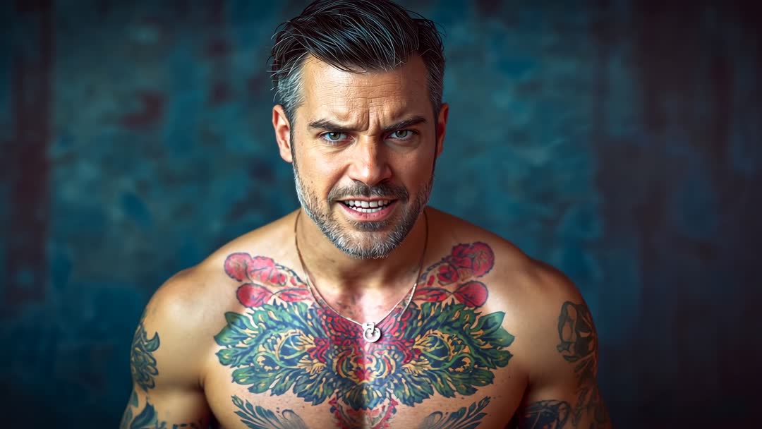 AI Generated Image. Close-up studio clip showing tattooed man smiling tightly, leaning forward, pointing toward camera and delivering intense gaze. Colorful chest tattoo and pendant adding strong focal points against moody blue backdrop. Strong directional lighting and shallow depth of field creating cinematic, dramatic tone. Suiting fitness promotions, tattoo studio marketing, lifestyle editorials, music or film trailers, dating app campaigns, and bold brand advertising. Offering crop options for banner, thumbnail, hero header, or social media reel; working well with color grading and slow-motion editing. Male subject appearing mid-30s to early-40s with salt-and-pepper hair and trimmed beard, conveying confidence, intensity, and edgy charisma.