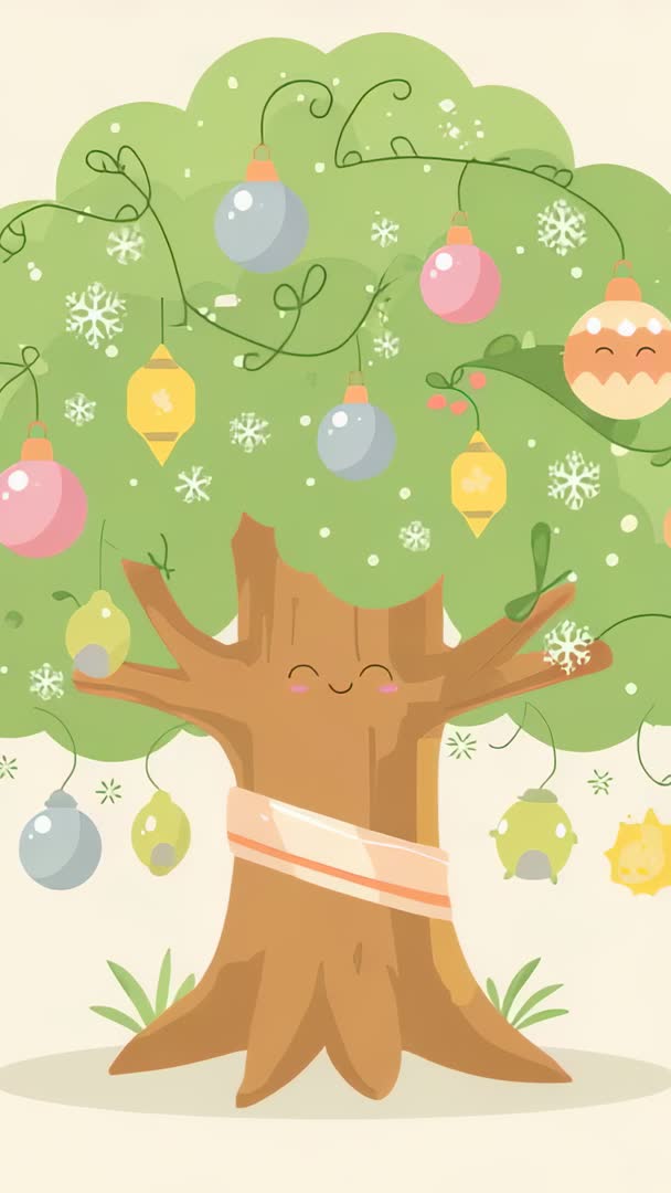 AI Generated Video. Vertical animated loop featuring smiling tree with swaying branches, colorful baubles, hanging garlands and drifting snowflakes. Pastel color palette with pink and blue ornaments creating gentle festive mood. Vertical orientation optimized for mobile viewing and social media stories. Ideal for holiday social posts, Instagram Reels, TikTok clips, mobile ad campaigns, seasonal greeting videos. Useful for kids content, classroom presentations, family event promotions, eco-friendly holiday campaigns. Easily trimmed for short loops, overlaid with text or logos, combined with music or voiceover. Visual tone working well with friendly brands, product showcases, greeting card animations and app intros.
