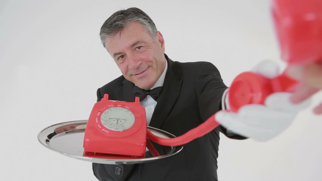 Smiling Waiter Offering Red Rotary Phone on Tray Video