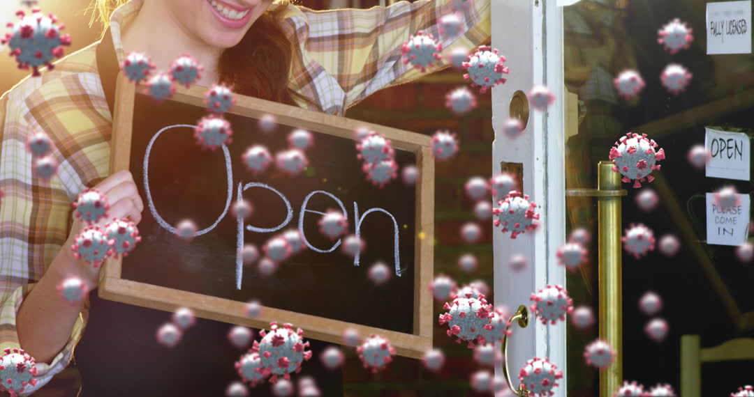 Smiling waitress holds an open sign outside a restaurant, with virus cell animation overlay, representing business challenges during the COVID-19 pandemic. Useful for illustrating the impact of COVID-19 on small businesses and public health measures in reopening strategies.