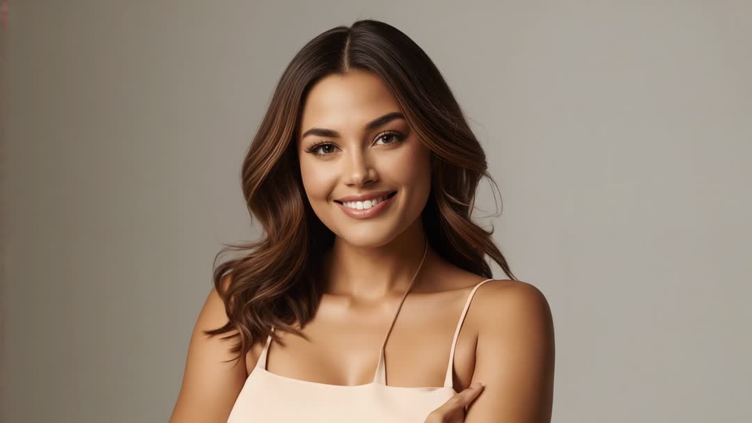 AI Generated Video. Video showing woman adjusting dress strap while smiling and facing camera in studio with neutral background and warm lighting. Tight portrait framing capturing upper torso, necklace detail, natural makeup, and soft waves in brown hair. Suitable for fashion campaigns, beauty product commercials, modeling portfolio reels, lifestyle blog headers, makeup tutorial thumbnails, social media advertising, and casting reels. Helping promote brand identity, showcasing jewelry detail, illustrating makeup techniques, and complementing editorial layouts. Delivering professional, elegant, warm mood for corporate headshot alternatives, influencer content, e-commerce hero shots, and personal branding. Including brief motion such as strap movement and subtle facial expression change ideal for B-roll, hero clip, and looping social media reels.