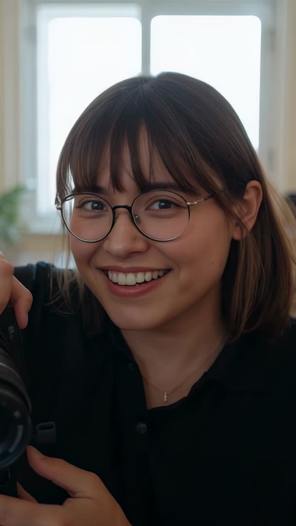 AI Generated Video. Smiling woman with glasses adjusting DSLR camera near backlit window in cozy home studio. Soft natural light illuminating face, creating warm skin tones and gentle catchlights in eyes. Vertical video composition with tight portrait framing, emphasizing camera interaction and authentic expression. Suitable for vlogging, photography tutorials, lifestyle content, social media reels, creator profiles, product demonstrations, online courses. Use as intro clip for camera gear reviews, behind-the-scenes footage for photography blogs, header for freelance photographer websites, or promotional content for camera workshops. Footage offering friendly, approachable vibe, easy integration with subtitles and lower thirds. Consider adding slow zoom or slight tilt for dynamic movement; pair with upbeat background music and voiceover for tutorial style.