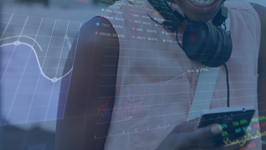 The video features a smiling African American woman using a smartphone while stock market data and financial graphs are overlayed, suggesting investment focus or business analysis in an outdoor setting. It is ideal for illustrating concepts around mobile technology in finance, investment trends, and the use of digital tools for analyzing stocks, suitable for blog posts, financial services websites, or technology advertisements.