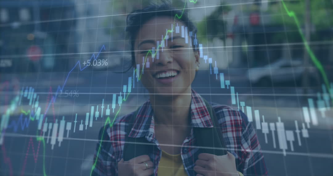 - Smiling Woman and Financial Data Overlay Illustrate Global Market Insights