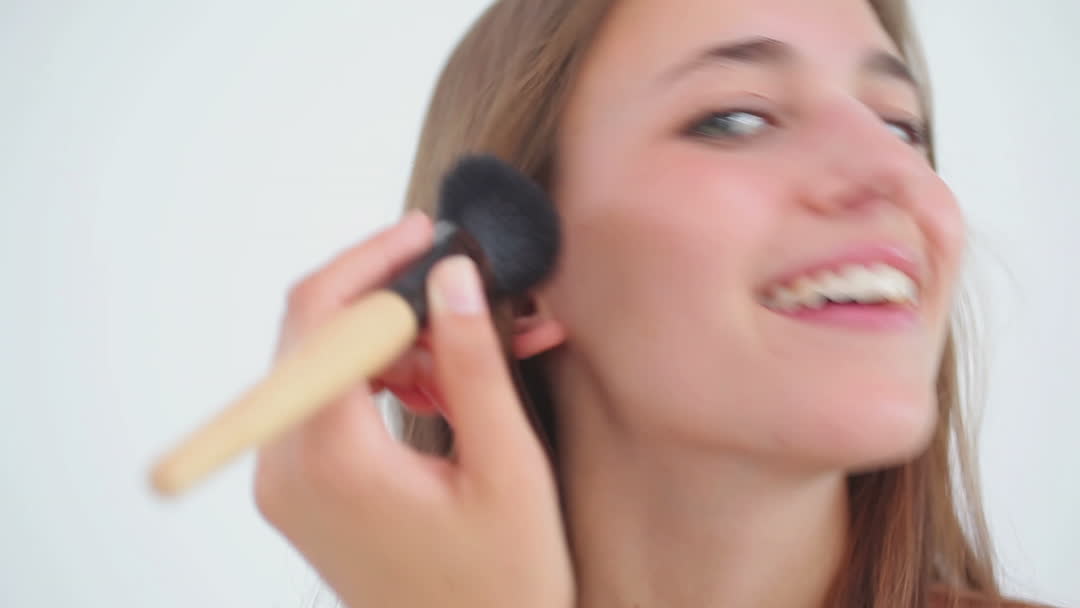 Woman cheerfully applying makeup with a powder brush against a white backdrop. Useful for beauty and skincare promotions, makeup tutorials, cosmetic product marketing, cheerful lifestyle content, and relaxation themes.