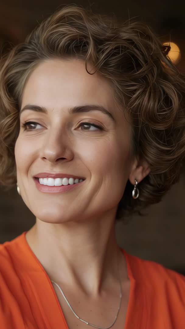 AI Generated Image. Vertical clip featuring close-up portrait of smiling woman with short curly hair, blinking and reacting to warm lamp light in cozy cafe. Wearing orange blouse, delicate drop earrings and thin chain necklace, presenting relaxed confident expression while looking slightly off-camera. Clip conveying cozy, inviting, tranquil, elegant, feminine mood suiting lifestyle and hospitality projects. Suited for social media stories, vertical ads, app promos, cafe branding, beauty and fashion content, dating app promos, corporate wellness campaigns and testimonial sequences. Editing suggestions: looping short blink for subtle motion, applying warm color grade to amplify lamp glow, adding soft ambient music and light room tone, incorporating gentle slow zoom or pan, including captions for accessibility and localized text overlays for multilingual campaigns. File works well as hero clip for landing pages, background for testimonial sequences, or headshot intro for presenter-led videos.