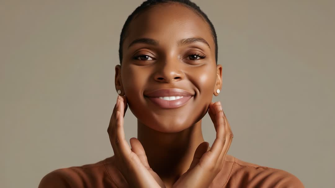 AI Generated Image. Video featuring close-up portrait of smiling woman cupping face and opening eyes while framing face with hands. Warm studio lighting creating soft glow on skin. Neutral beige background keeping focus on expression and subtle movement. Brown top and stud earrings adding minimalist styling detail. Usage ideas: beauty campaigns, skincare tutorial clips, wellness commercials, lifestyle reels, social media profile video, website hero clip, cosmetic product promo, facial care before-and-after sequence. Editing suggestions: slow motion and loop cuts enhancing calming mood, color grading boosting warm tones, adding soft ambient soundtrack, overlaying product shots or text callouts, using lower-thirds for brand messaging.