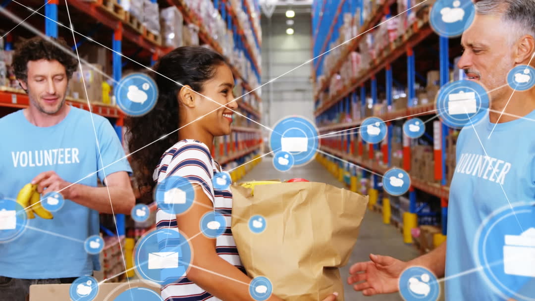 Groceries support cause through philanthropy at warehouse. Use for charities, community welfare promotion, or volunteer recruitment campaigns. Depicts positive engagement and technological advancement in charitable processes.