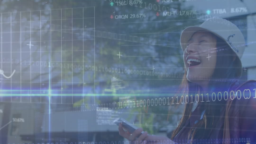 Depicts a woman interacting happily with her smartphone while digital financial data and codes illuminate the scene. Ideal for illustrating concepts of technology-driven connectivity, financial data analysis, digital lifestyle, and personal interaction with global data networks.