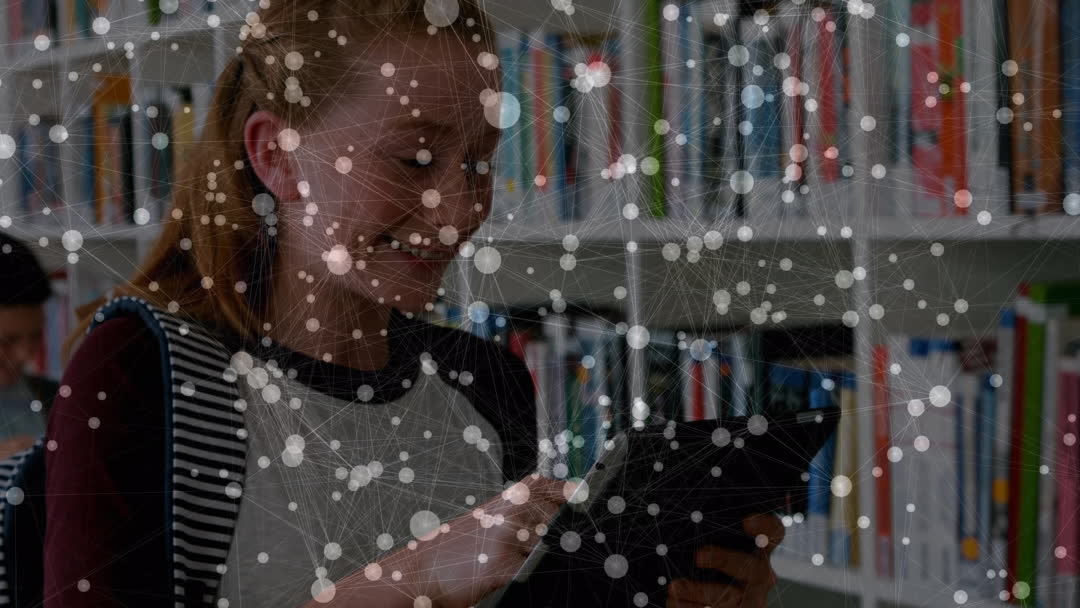 A young woman smiles while using a tablet in a library, foregrounded by a complex virtual network graphic overlay. This suggests themes of connectivity, technology, and digital learning in educational environments. Useful for marketing technology in educational sectors, illustrating digital literacy, or portraying modern studies and data management.
